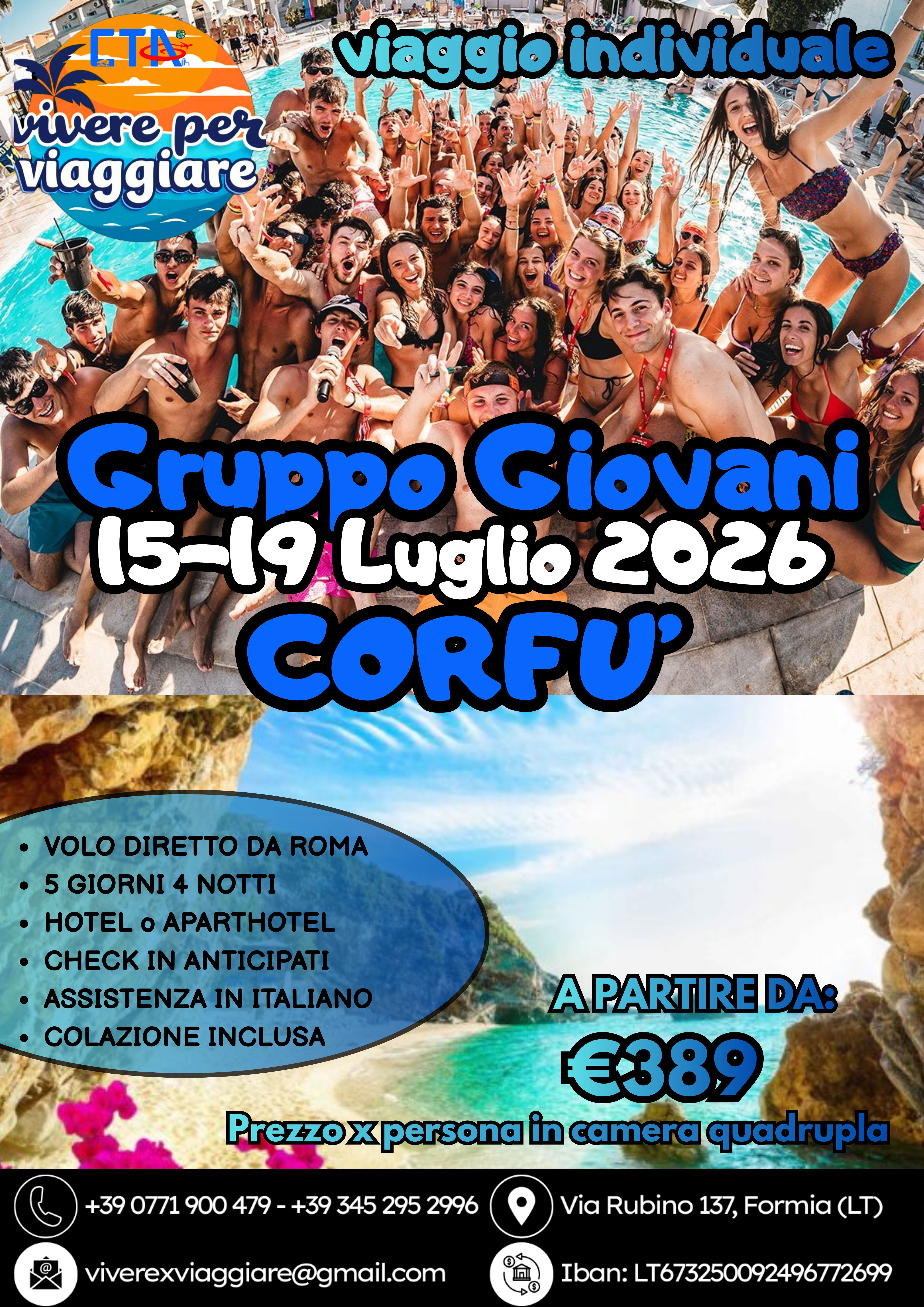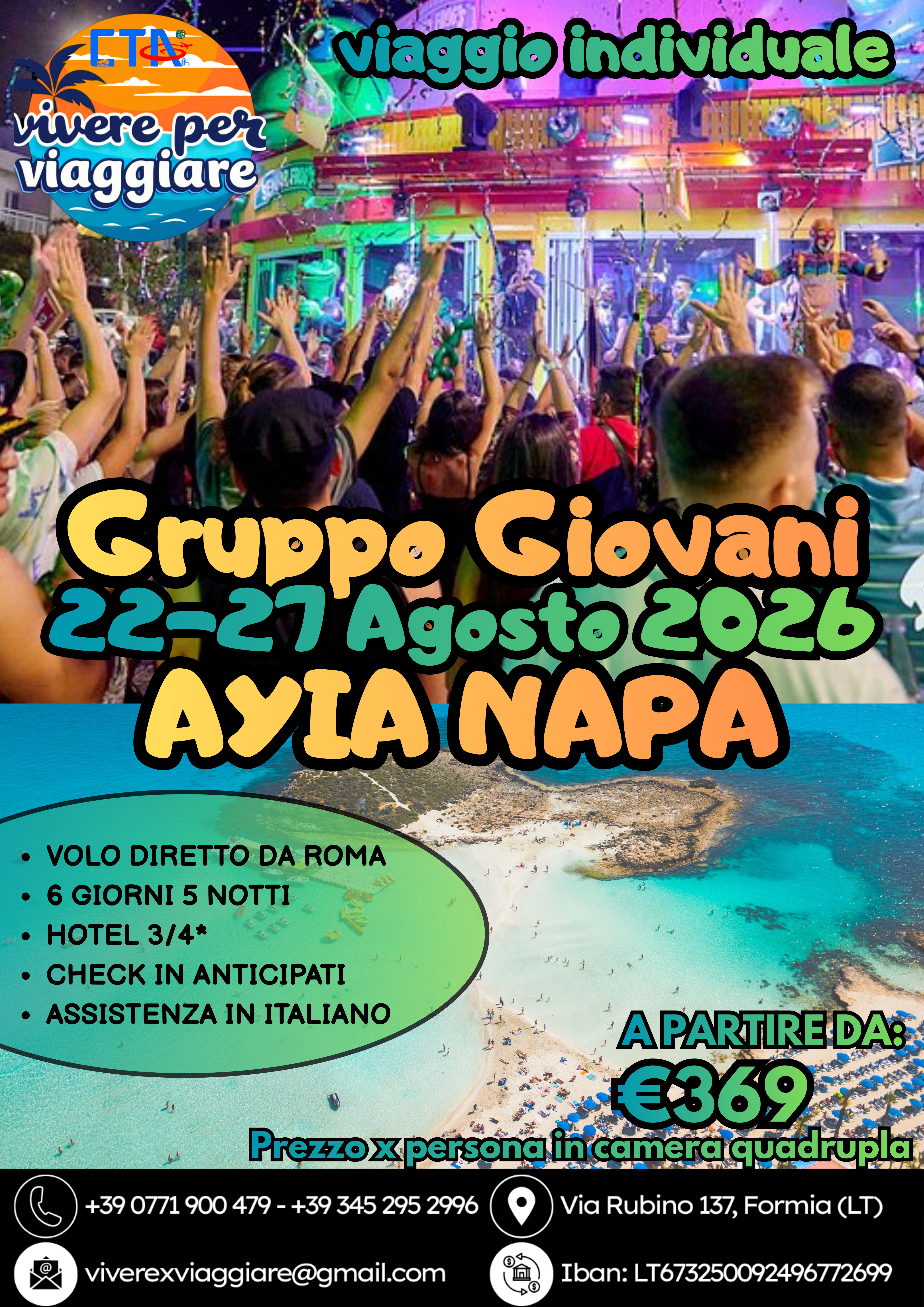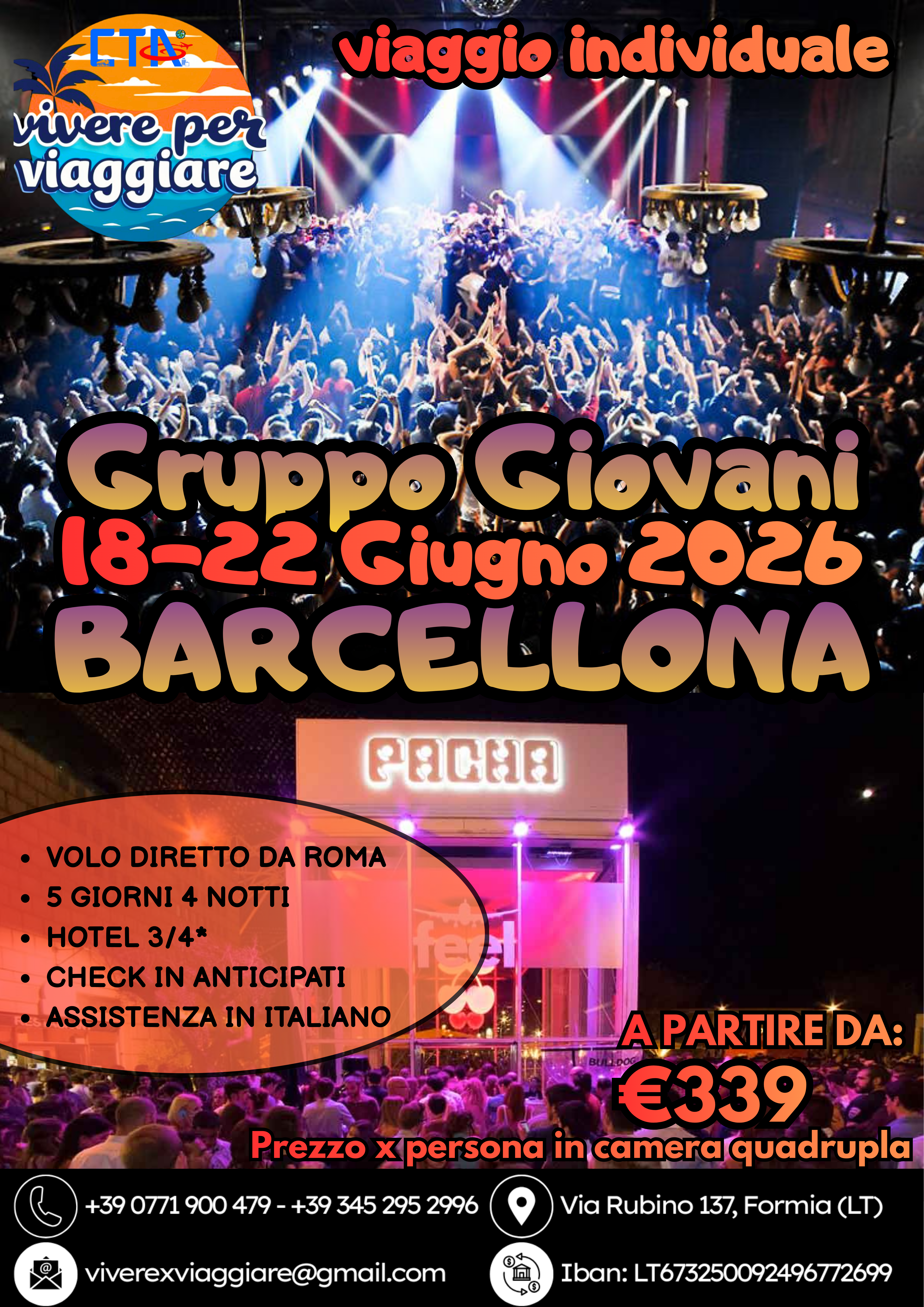 Viaggi di gruppo Giovani estate 2026 Barcellona 18-22 Giugno 2026Scarica la locandina! Corfù 15-19 Luglio 2026Scarica la locandina! Ayia Napa 22-27 Agosto 2026Scarica la locandina!